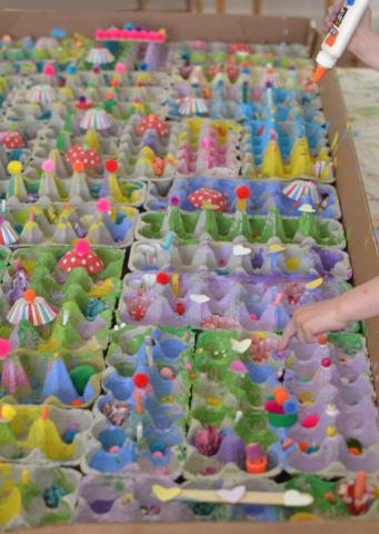 Co-create a large "landscape" made of recycled egg cartons! First we'll paint, then we'll glue on whimsical features like pom poms, pipe cleaners, cupcake liners, and other repurposed goodies. Our final collaborative piece will be displayed in the Kids' Area for an extended period.